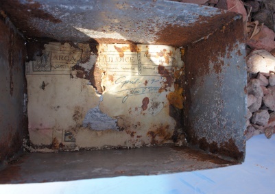Cornerstone Contents RevealedApproximately 300 people attended the celebration of the 100th anniversary of the laying of the library cornerstone on Saturday, April 23, 2016, in the library's parking lot. Children from the Plattsmouth Middle School sang three songs and presentations were made by Mayor R. Paul Lambert, historian Harlan Seyfer, and library patron Gail Johnson. Those in attendance were able to see Public Works Director Gary Helwig and Grounds Maintenance Supervisor Jesse Clark remove the receptacle from the cornerstone. "Sattler" and "April 19" were written on the bottom of the metal box. April 19, 1916, is the day the cornerstone was laid; Sattler had just been elected mayor. From the Plattsmouth Journal dated April 6, 1916, "For mayor, John P. Sattler, the democratic candidate, received a majority of 97 over Mayor E. J. Richey, the present occupant of the office...." The box and some of the papers had a considerable amount of rust on them, so not everything was legible. The mayor, Mr. Seyfer, Margo Prentiss from the museum, and Library Director Karen Mier helped describe the contents before they were put in protective sleeves for preservation and for better viewing. The items in the cornerstone are identified below and are on display in the library.